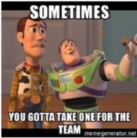 ‘to take one for the team’ is an expression from sports. It means ‘to fail or to get hurt so that your team can win’. For example, an American footballer called Ronnie Lot once badly broke his little finger. If he had had many surgeries to fix that finger, he wouldn’t have been able to play in the football championships that year. So Ronnie Lot got his damaged finger cut off so he could recover faster and help his team! If you say, ‘I’m going to take one for the team’, you are saying ‘I’m ok to suffer to help you all’. If you say, ‘Take one for the team!’, you are telling someone else, ‘Be a hero and suffer for us!’ This expression can be used in business, friendship – anywhere there are groups. It has a positive nuance.